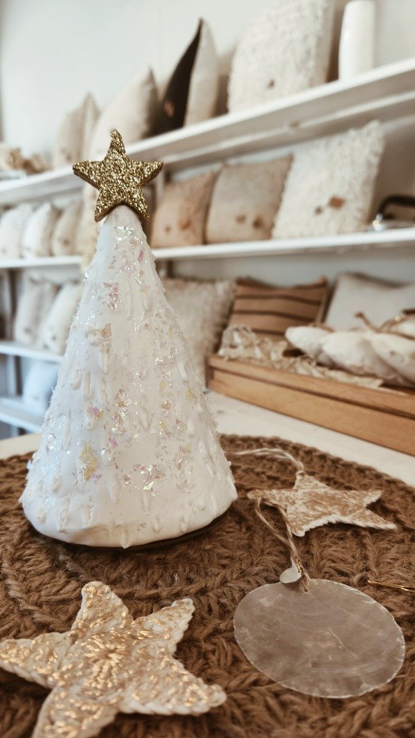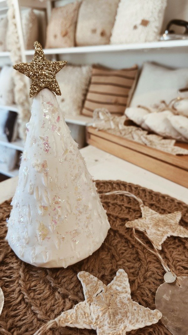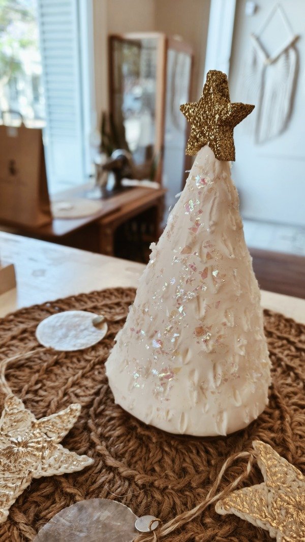 En porcelana fría color blanco, estrella dorada en la punta + lluvia de escarcha iridiscente.