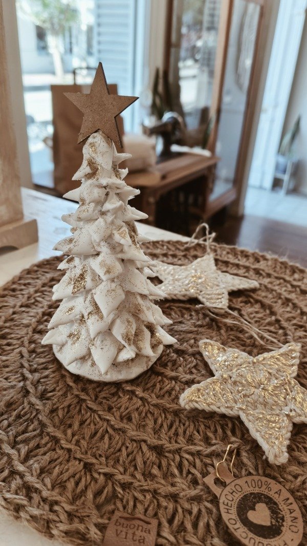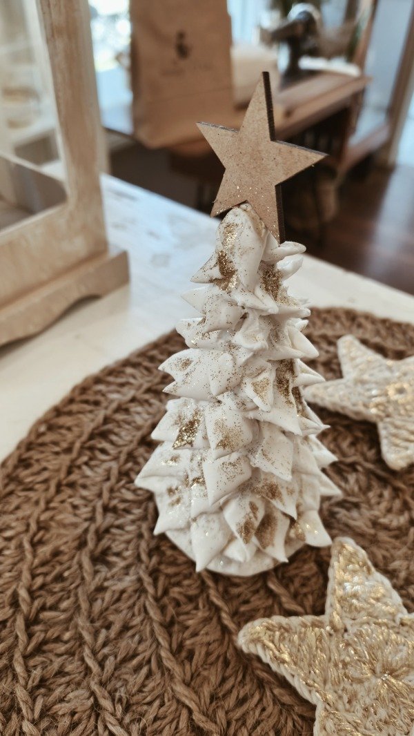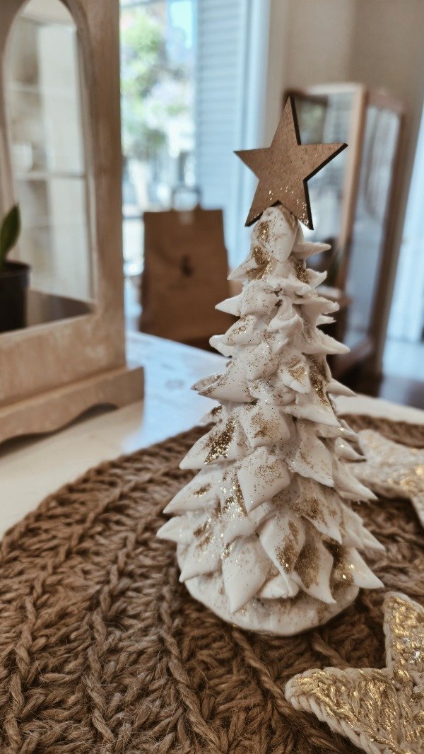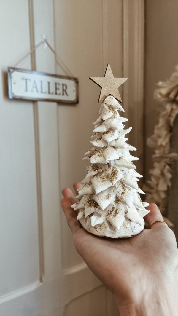 Con picos blancos en porcelana fría y estrella de madera en la punta + lluvia de glitter dorado.