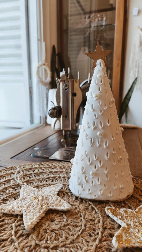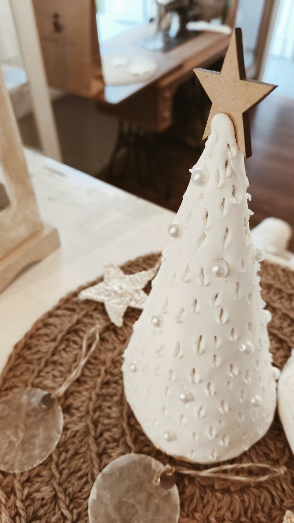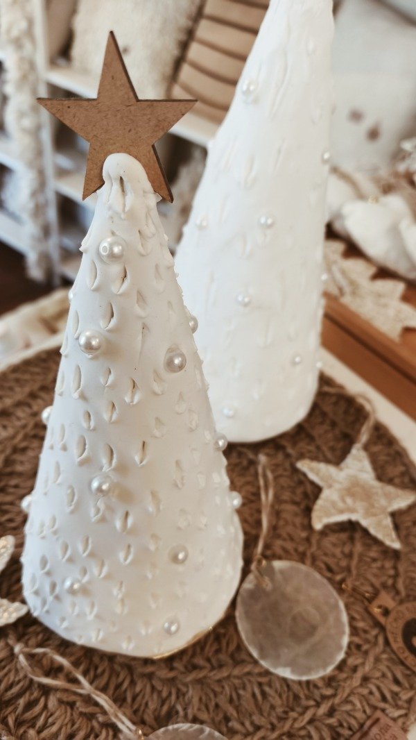 En porcelana fría blanca con textura y perlas, y estrella de madera en la punta.