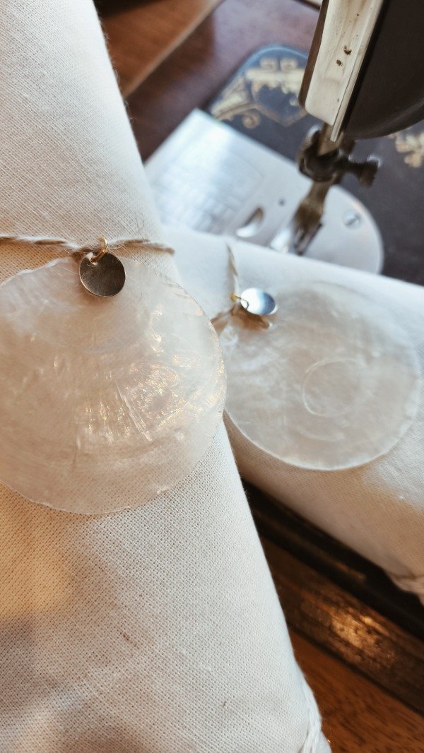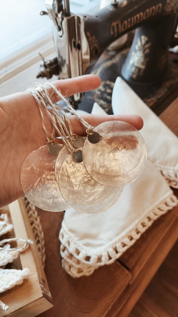 Con lentejuelón de nácar de 5,5cm de diámetro, cordón de yute y algodón, y detalle de mini lentejuela de chapa en plata.