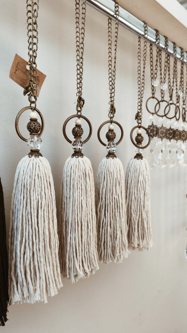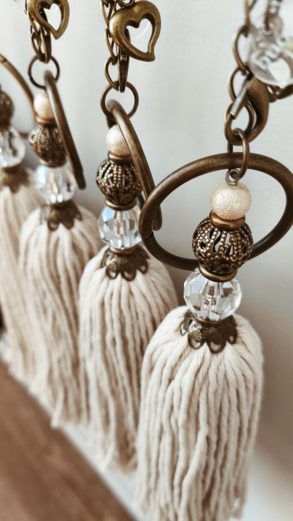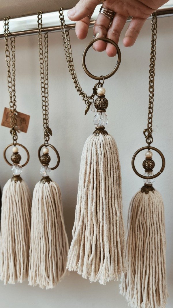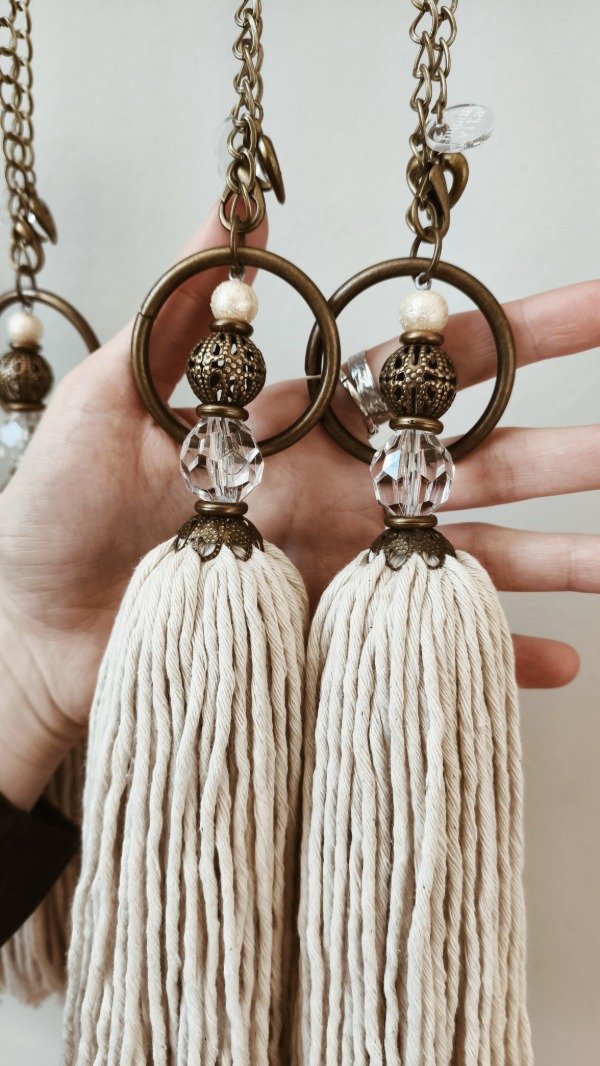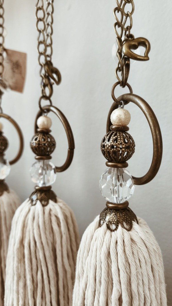 Borla de hilo de algodón peinado, con cadena de bronce envejecido y detalle de filigranas y cairel.