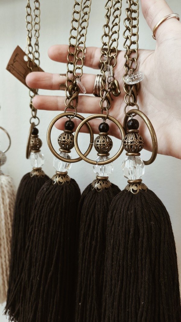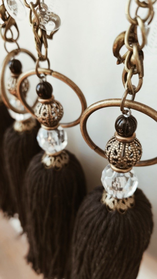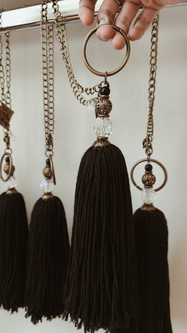 Borla de hilo de algodón peinado en color negro, con cadena de bronce envejecido y detalle de filigranas y cairel.