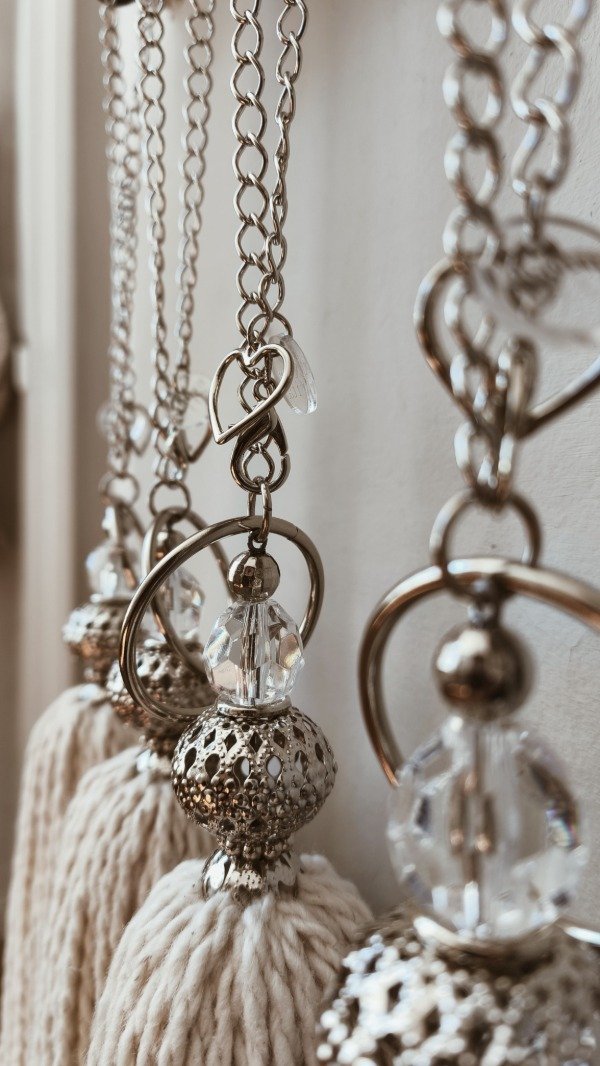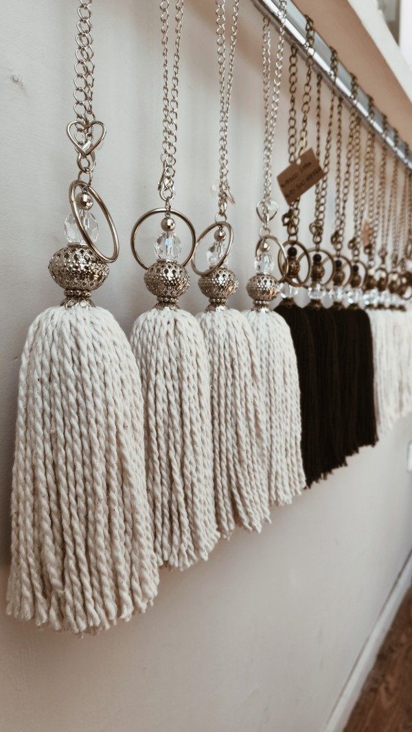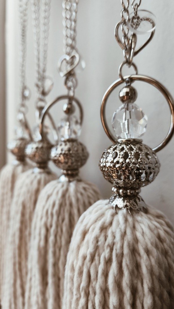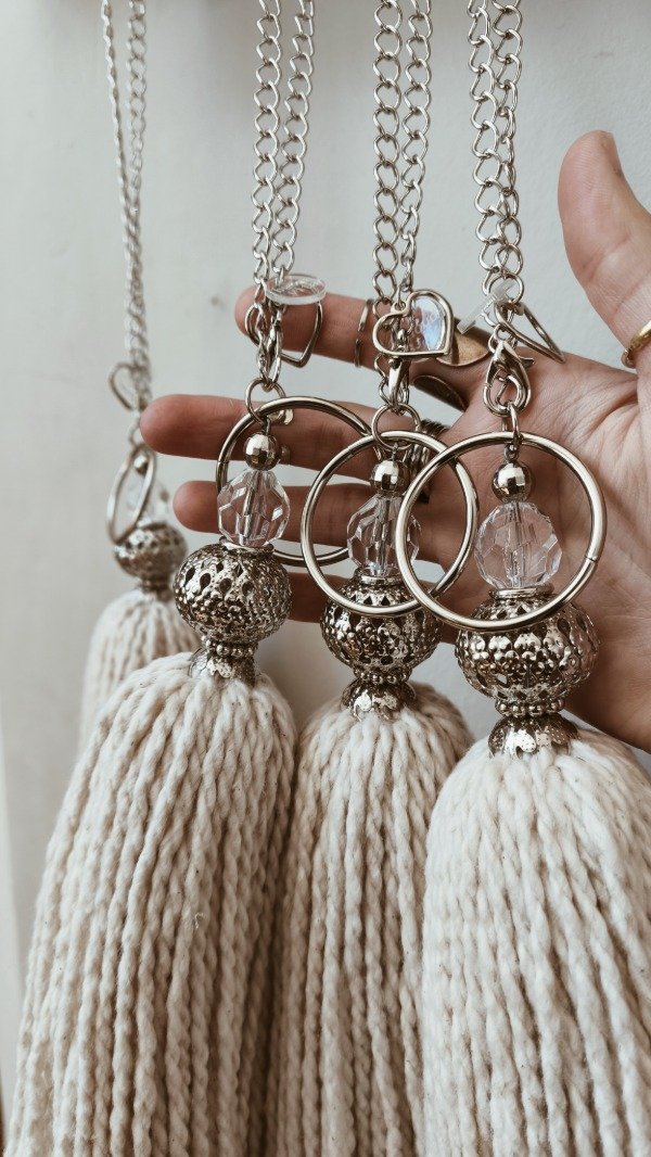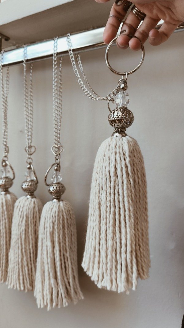 Borla de mecha 100% algodón, con cadena plateada y detalle de filigranas y cairel.